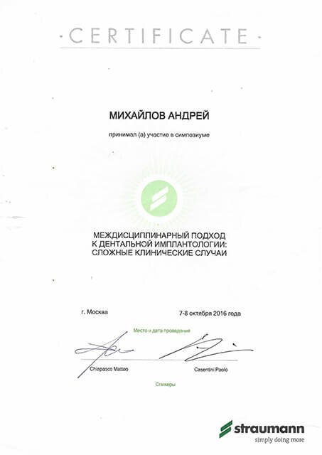 - 2016 г. Обучение на курсе «Междисциплинарный подход к дентальной имплантологии: сложные клинические ситуации», Екатеринбург.