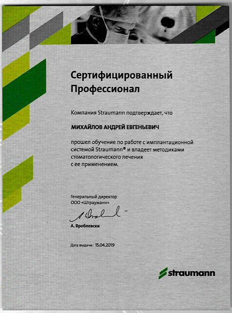 - 2019 г. Oбучение на курсе «Работа с имплантационной системой Straumann», Екатеринбург.