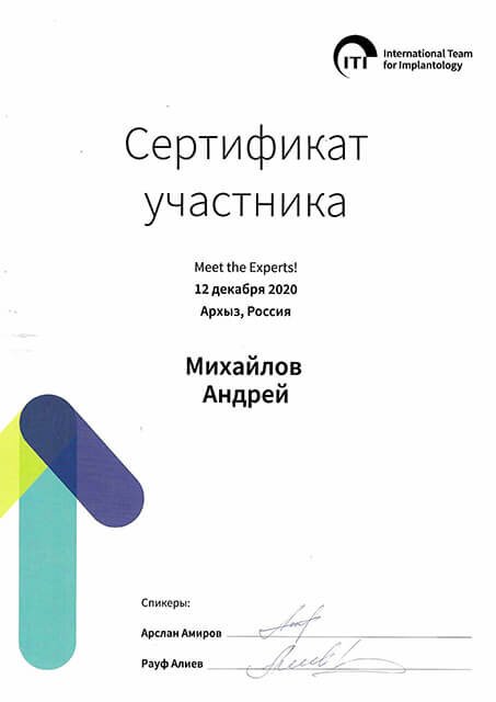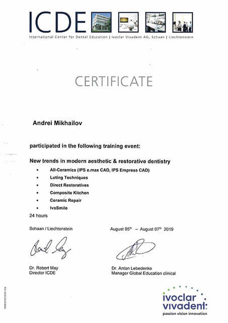 - 2018 г. Oбучение на курсе «Восстановление функции и эстетики у пациентов с частичным или полным отсутствием зубов. Хирургический и ортопедический этапы», Екатеринбург.