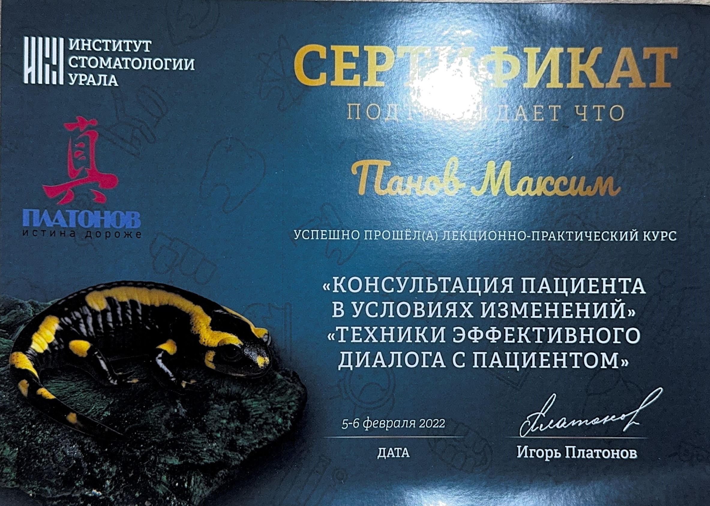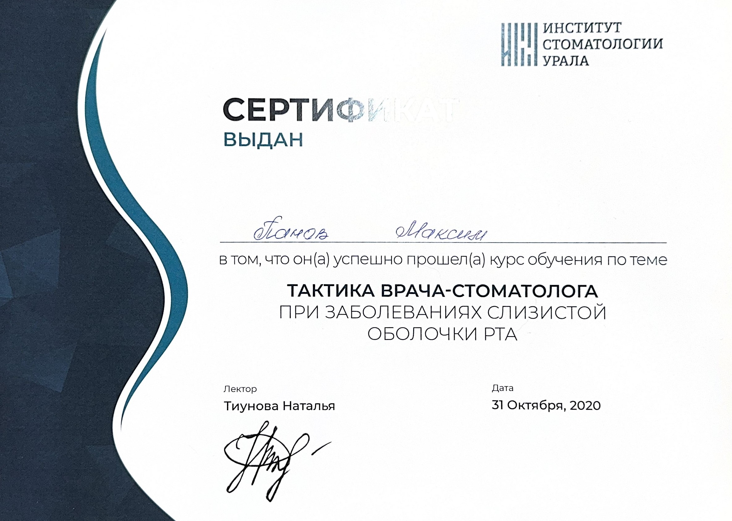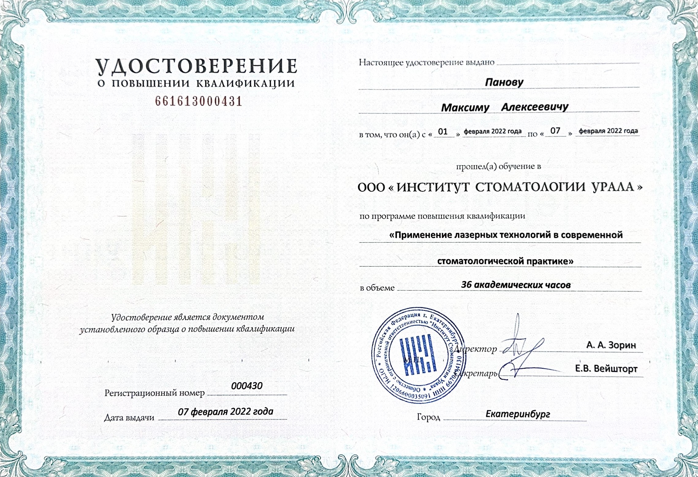 Обучение в ООО «Институт стоматологии Урала» по программе повышения квалификации «Применение лазерных технологий в современной стоматологической практики»
