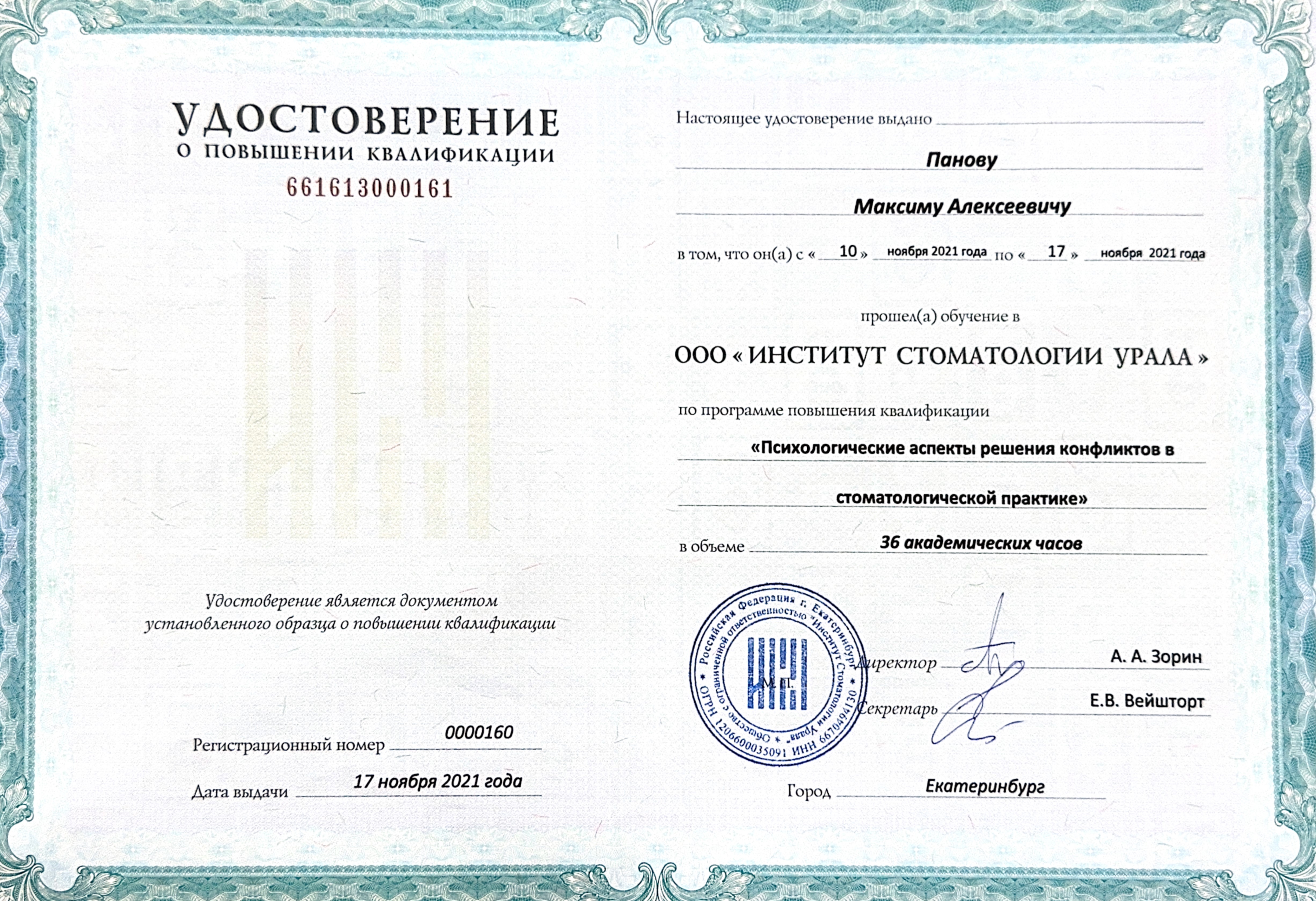 Обучение в ООО «Институт стоматологии Урала» по программе повышения квалификации «Психологические аспекты решения конфликтов в стоматологической практике»