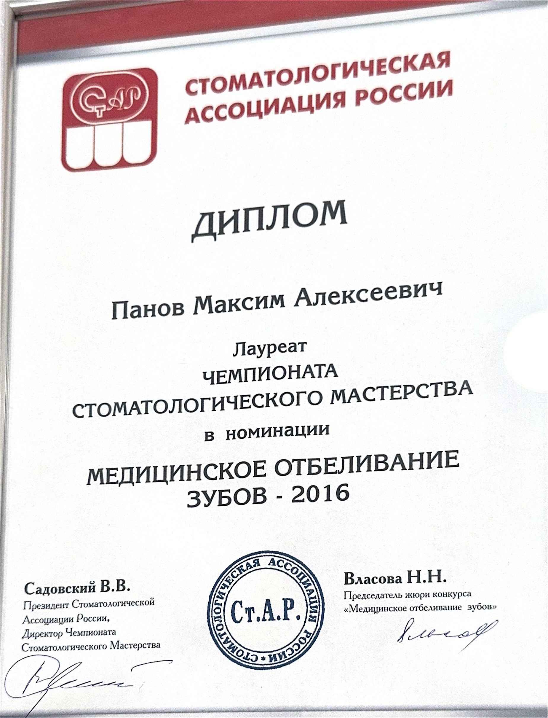 Лауреат Чемпионата стоматологического мастерства в номинации «Медицинское отбеливание зубов - 2016»