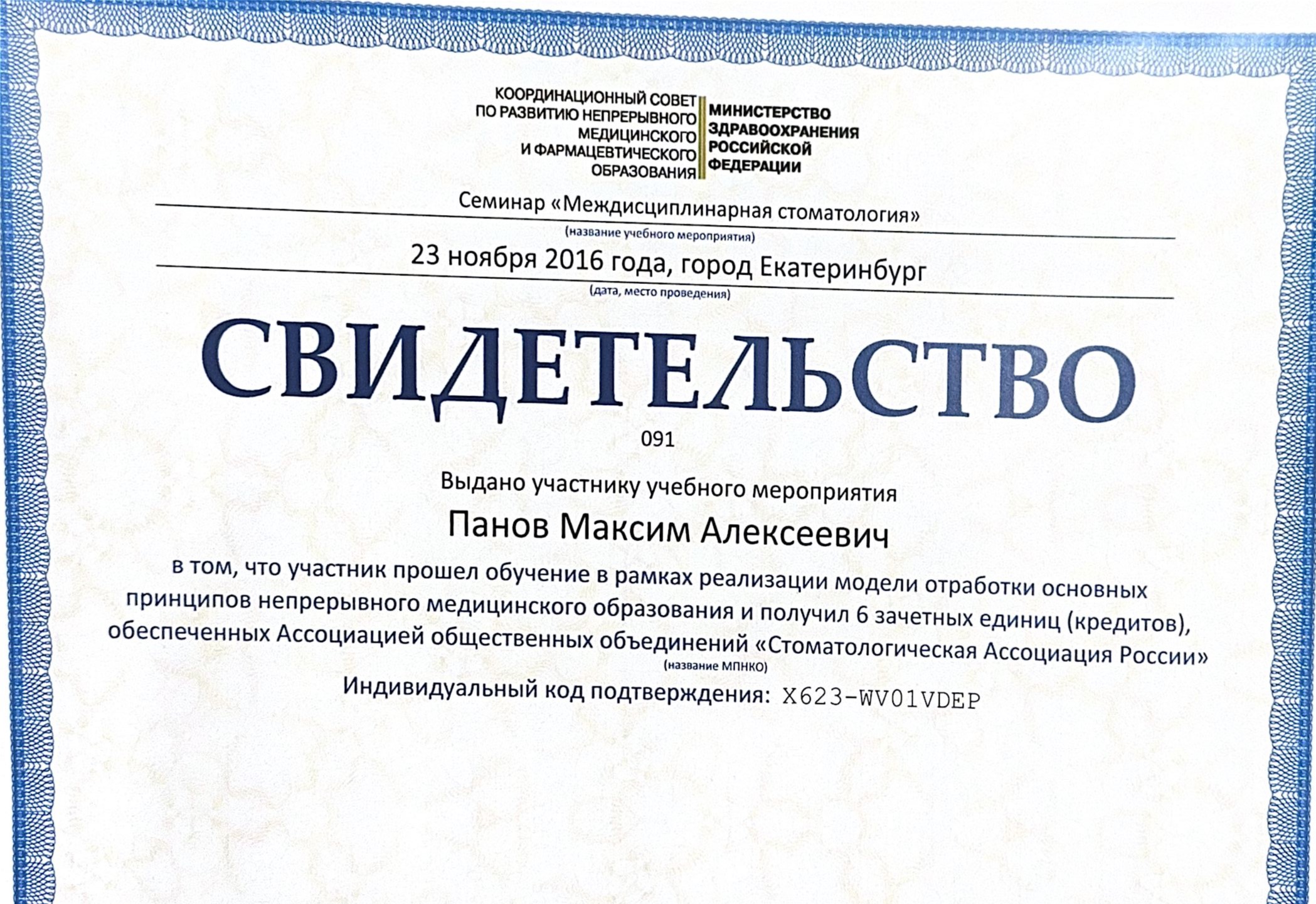 Лауреат Чемпионата стоматологического мастерства (2016 г.)