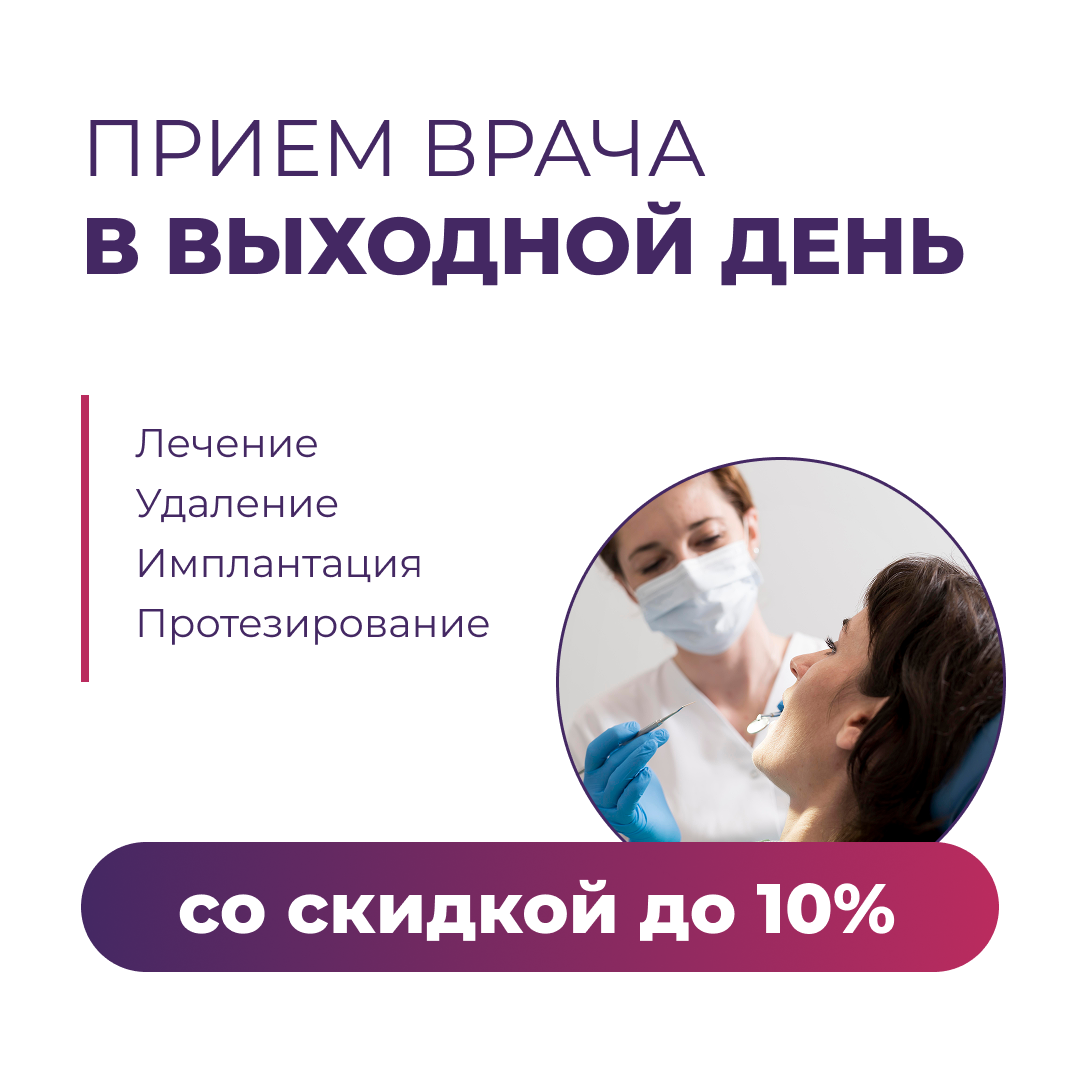 Запишитесь к стоматологу на субботу или воскресенье и получите скидку до 10% на лечение, удаление, имплантацию и протезирование.
